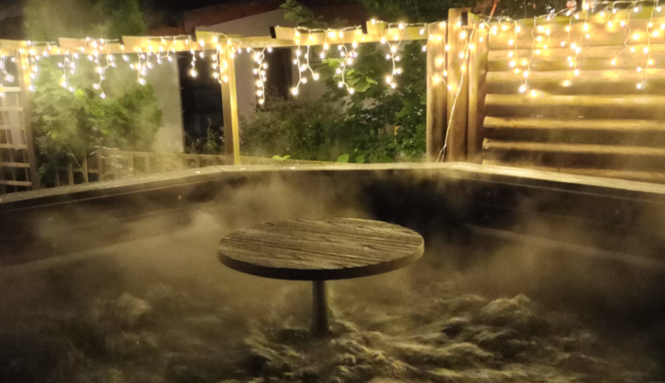 Kąpiel pod gwiazdami w wodzie ogrzewanej żywym ogniem, z dodatkiem ziół